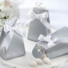 New, never used. Silver, wedge-shaped box with white die-cut "Love" that pops up when folded is accented with a white satin ribbon bow and the words "Live, Love, Laugh." Excellent for weddings. Measures 2 ½” x 2” x 4 ¾” Includes favour box and ribbon Sold as a set of 24. Have 4 packages.
